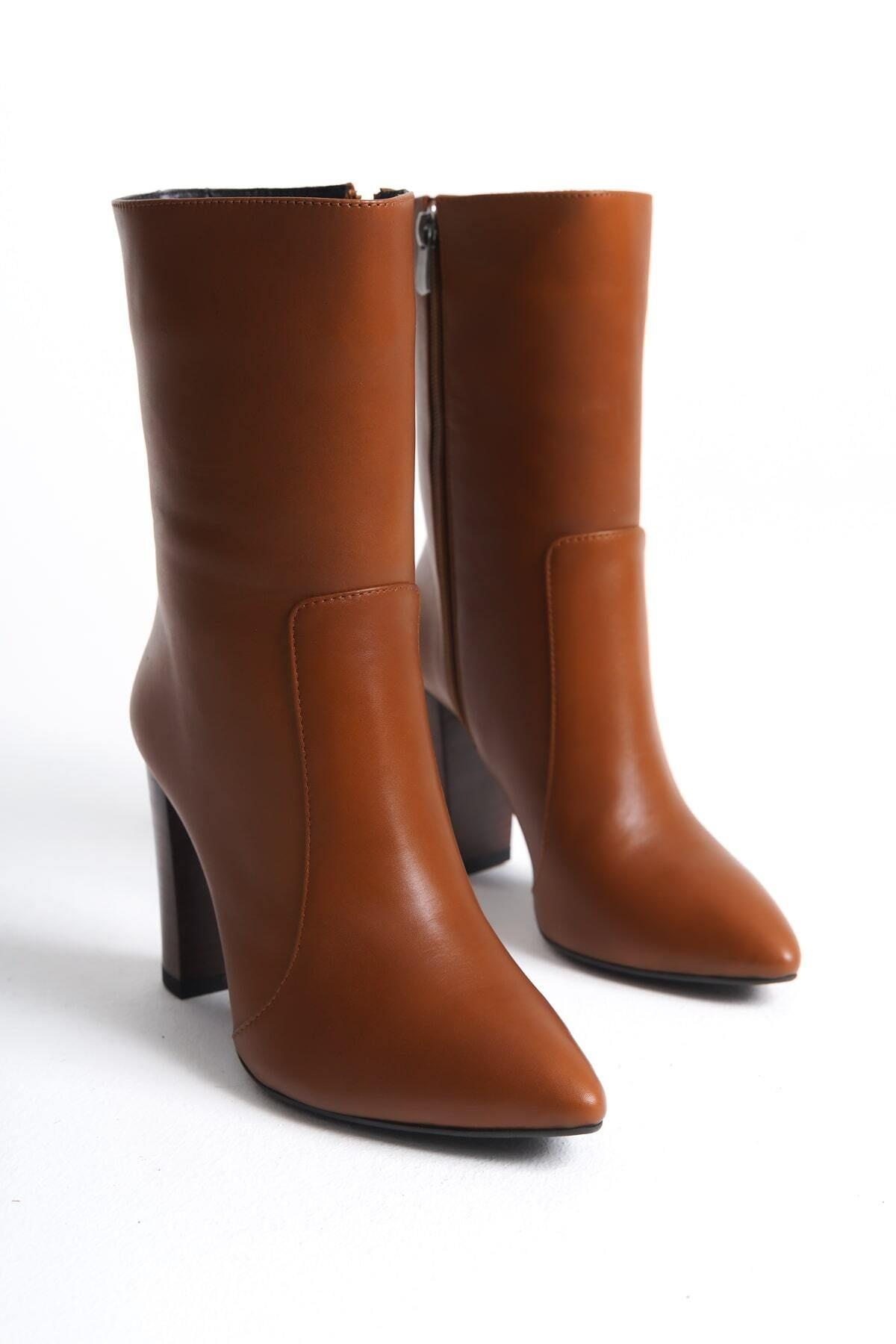 Mubiano Collection Kadın Fermuarlı Sivri Burun Topuklu Kısa Deri Bot Taba - MCALM23151 -