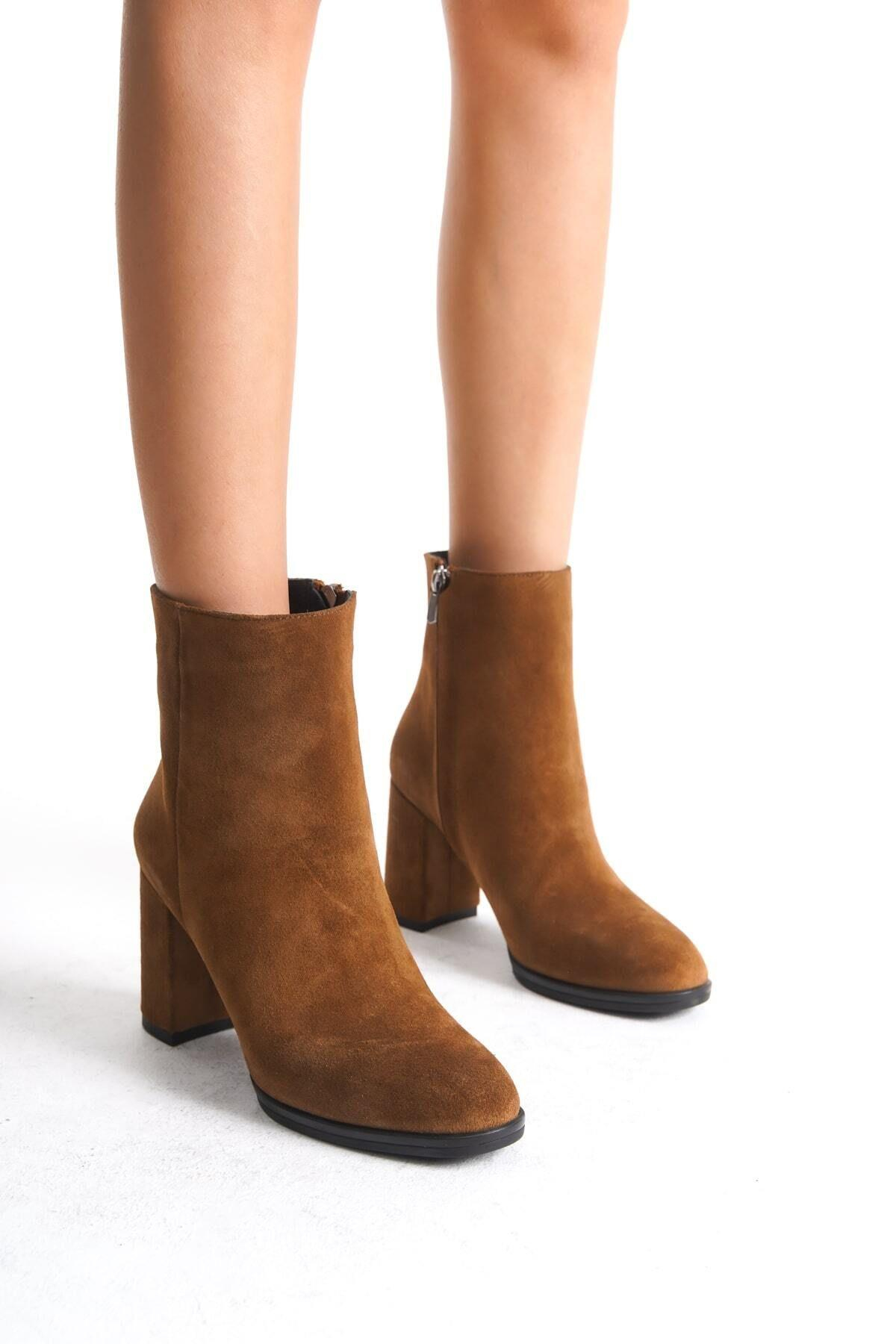 Mubiano Hakiki Deri Collection Kadın Fermuarlı Yuvarlak Burun Kalın Topuklu Kısa Süet Bot Taba - MCALM4221 - TB