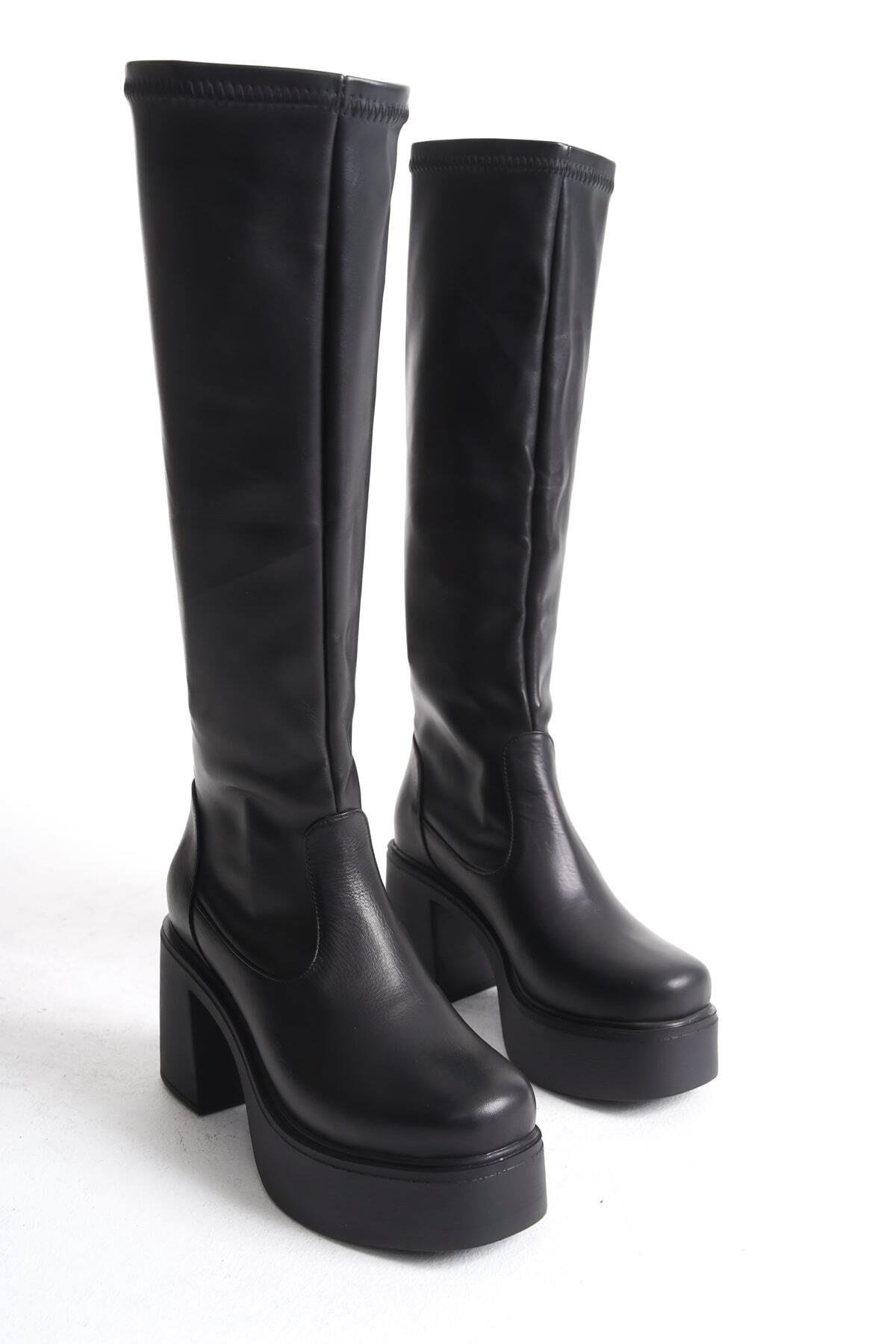 Mubiano Collection Kadın Kısa Topuklu Platform Taban Streç Deri Çizme Siyah - MCZFR4444 -