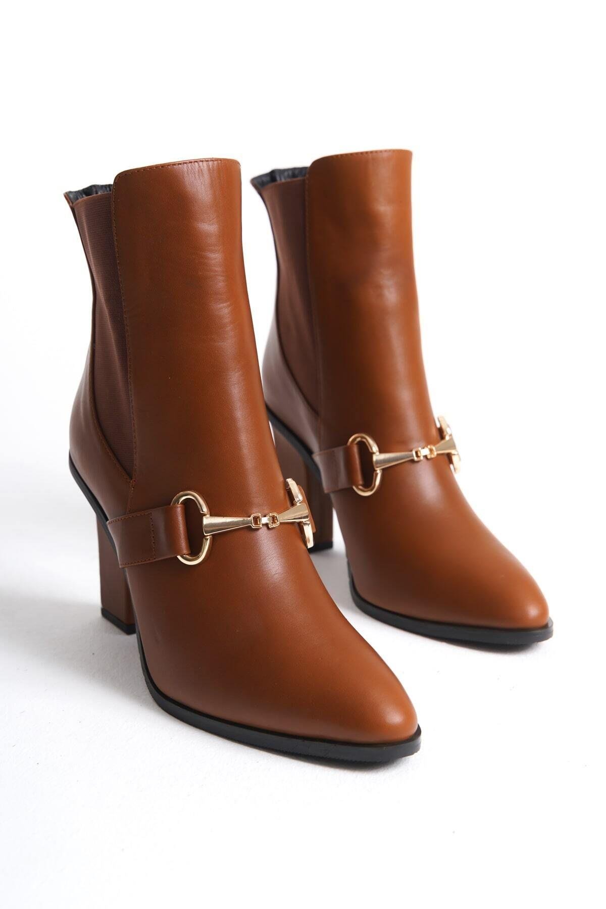 Mubiano Collection Kadın Metal Tokalı Lastik Detaylı Topuklu Kısa Deri Bot Taba - MCALM2262 -