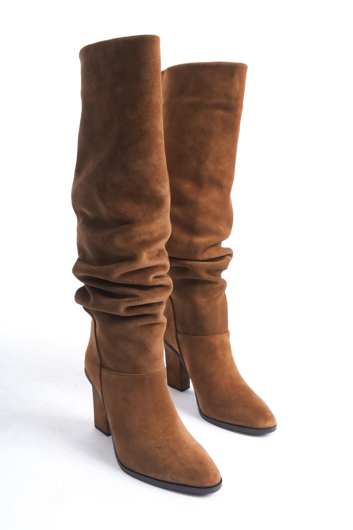 Mubiano Hakiki Deri Collection Kadın Topuklu Körüklü Süet Çizme Taba - MCALM4243 - TB