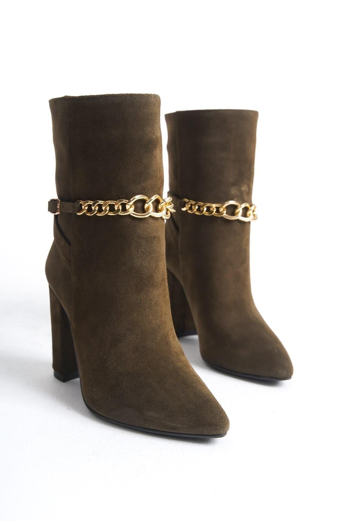 Mubiano Collection Kadın Zincir Detaylı Topuklu Süet Bot Haki - MCALM23142 -