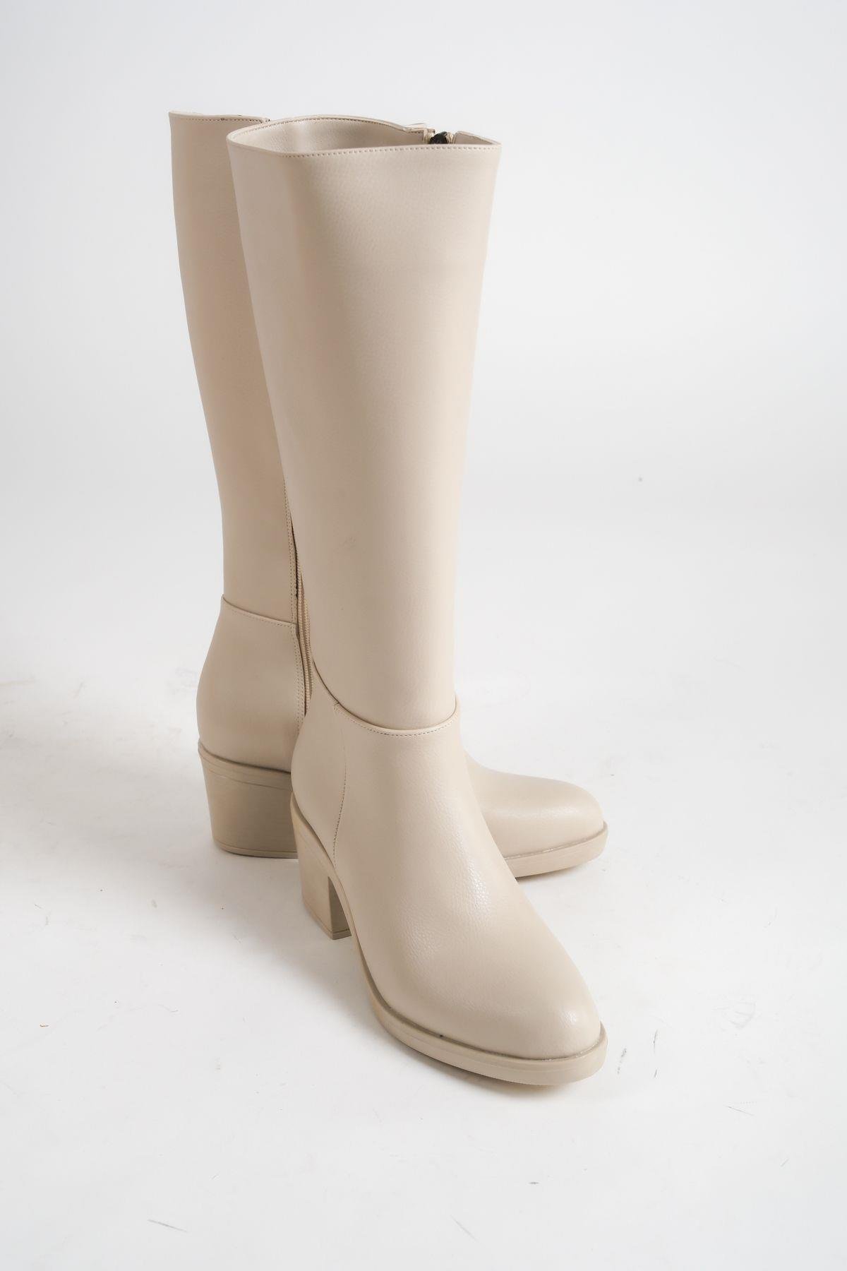 Mubiano MBHSN7072-BJ Kadın Bej Kalın Topuklu Fermuarlı Uzun Çizme