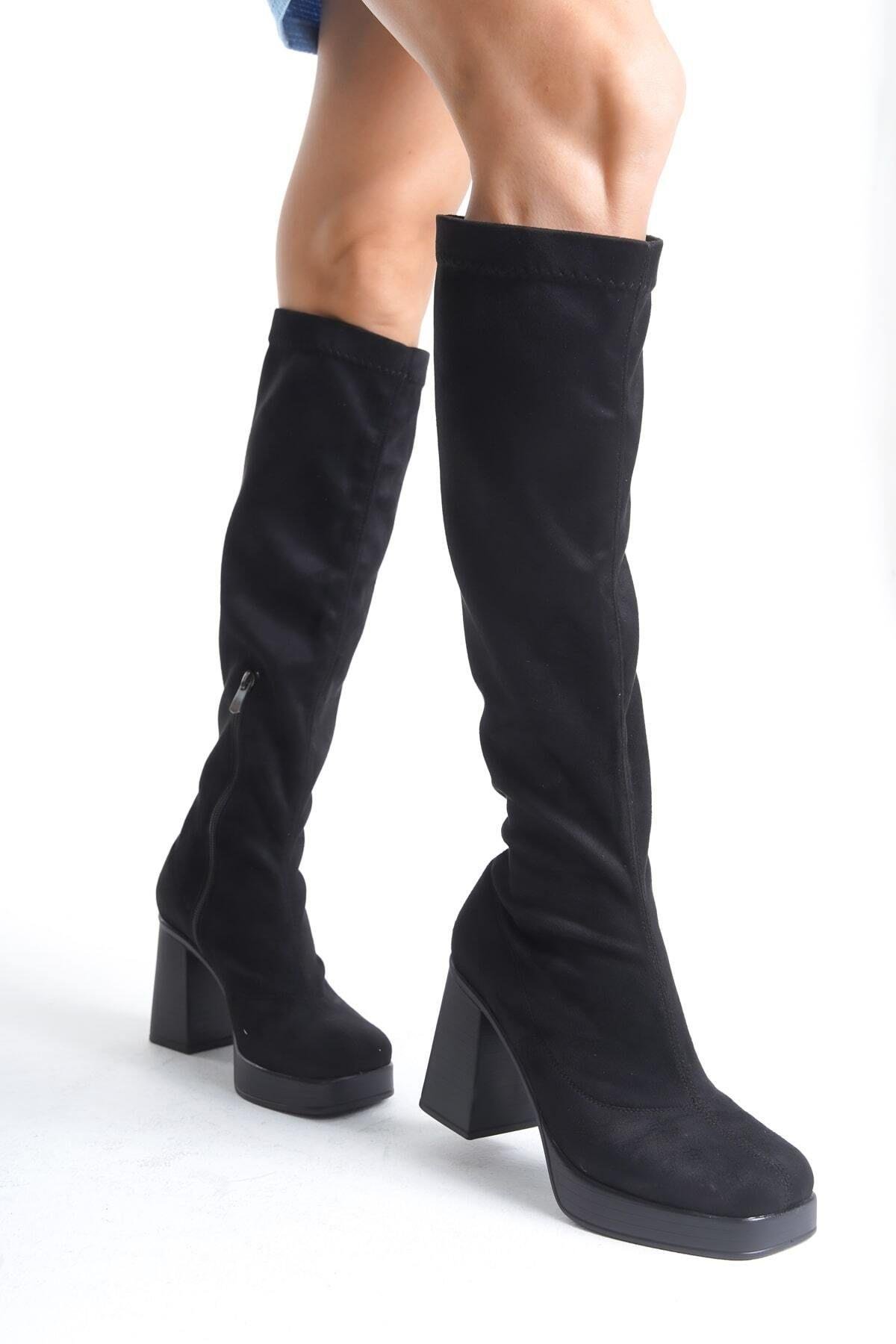Mubiano MBSR1070-S Kadın Süet Kalın Topuklu Siyah Diz Üstü Çorap Çizme